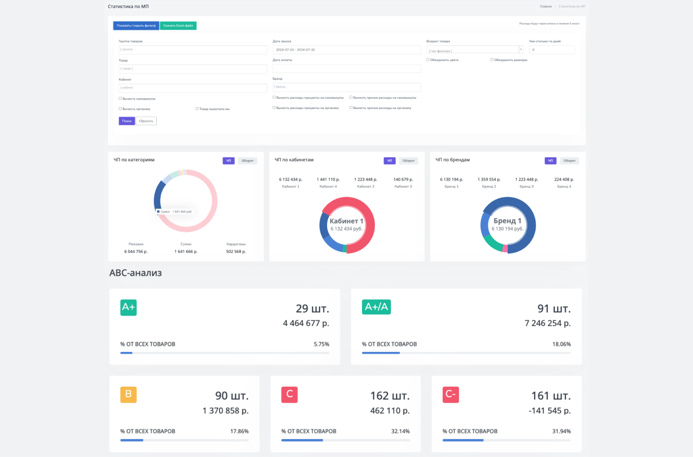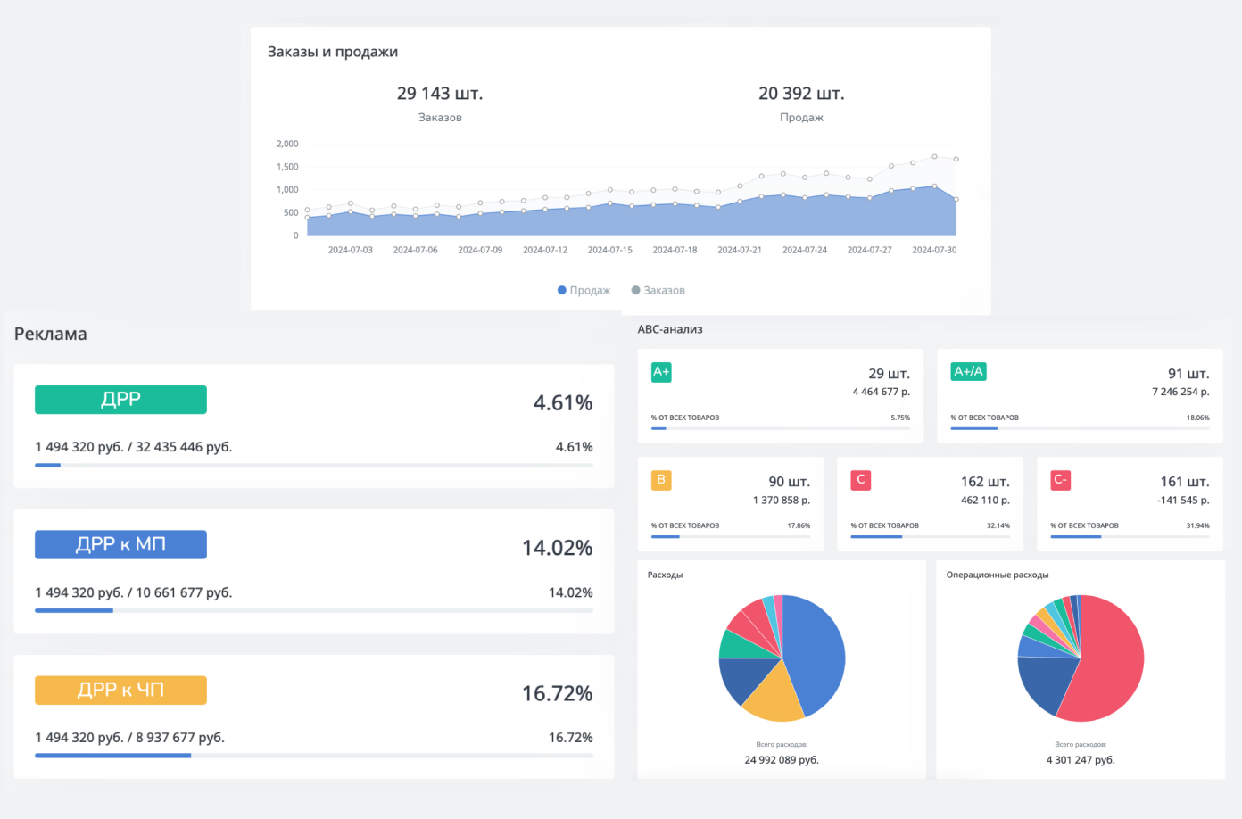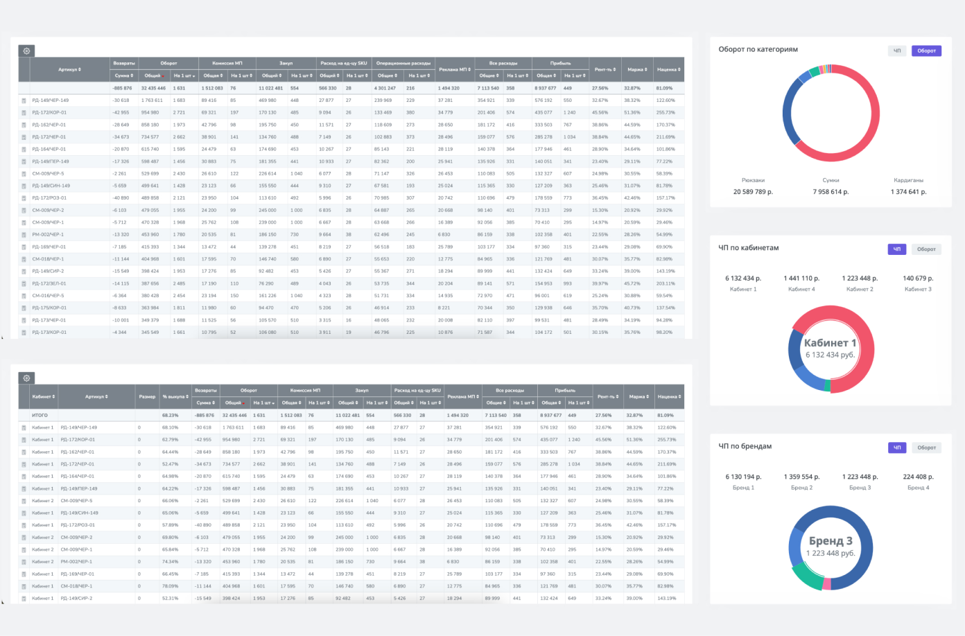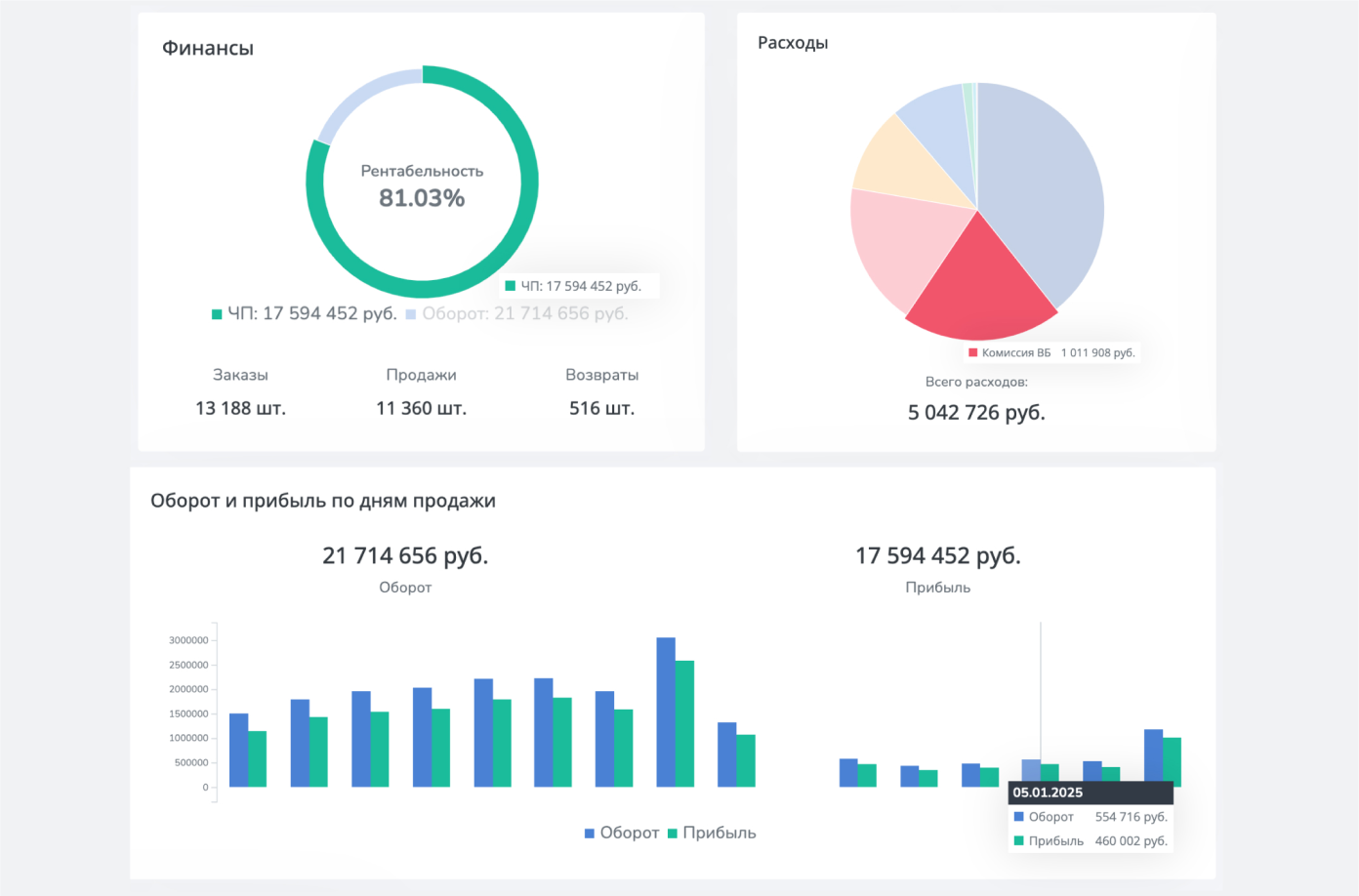 Вы получите полную детализацию: чистая прибыль, маржинальность, анализ комиссий, расходы на рекламу и многое другое.