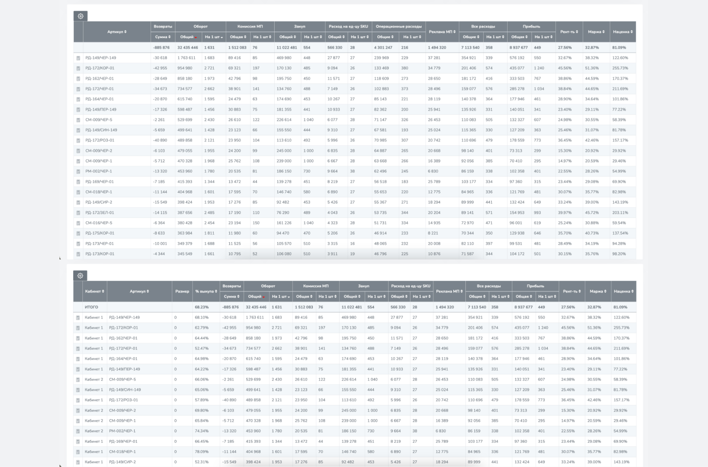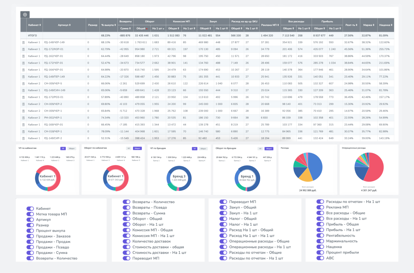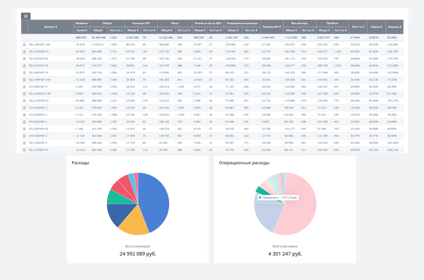 Детализированный расчет чистой прибыли для каждого товара. Вы сможете видеть финансовый результат не только бизнеса в целом, но и по каждому SKU.