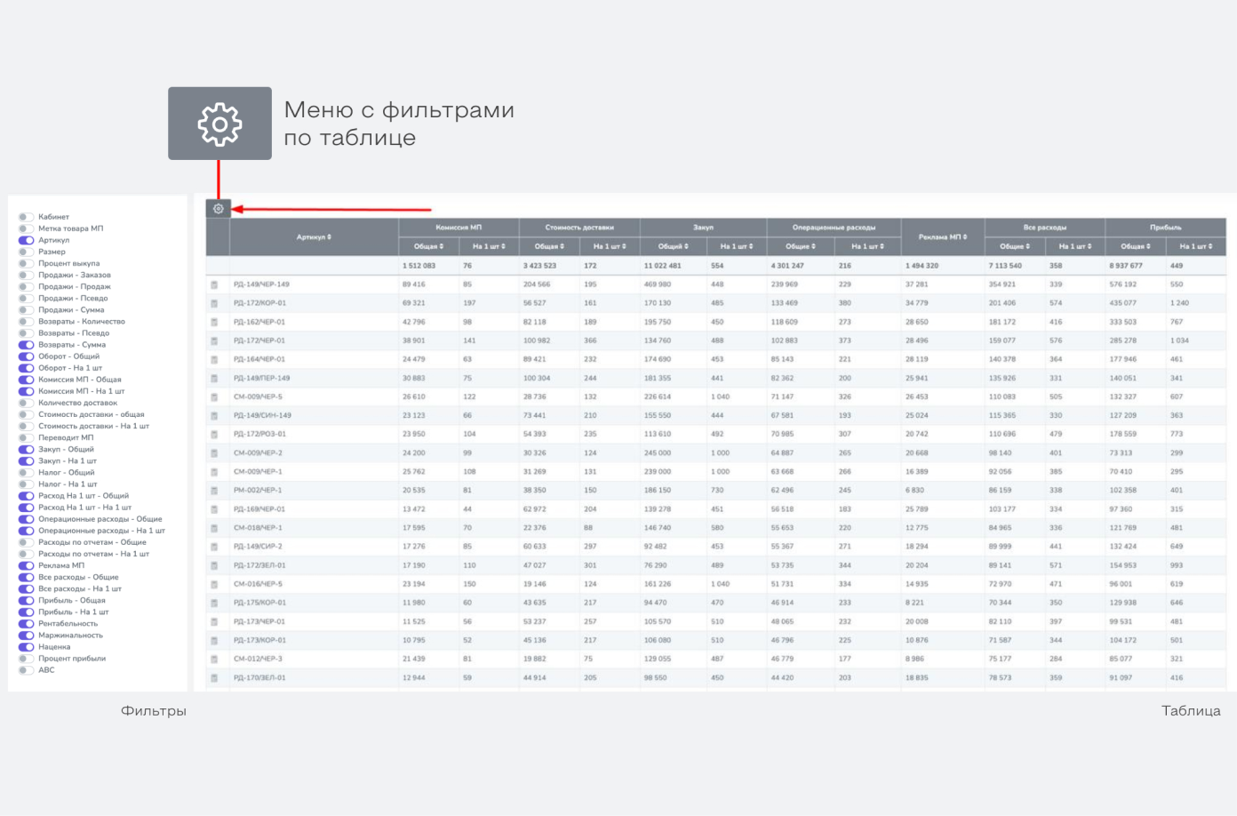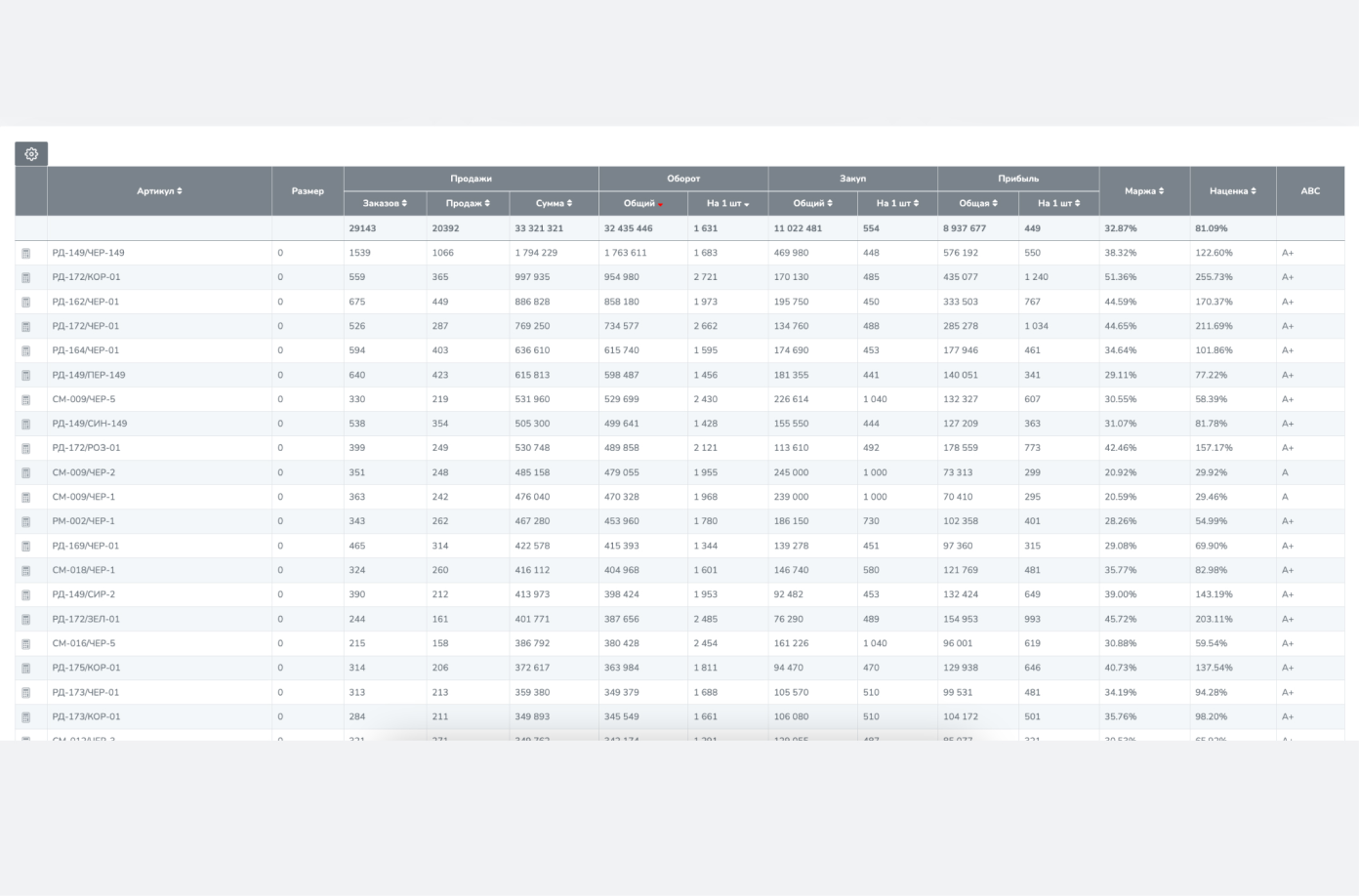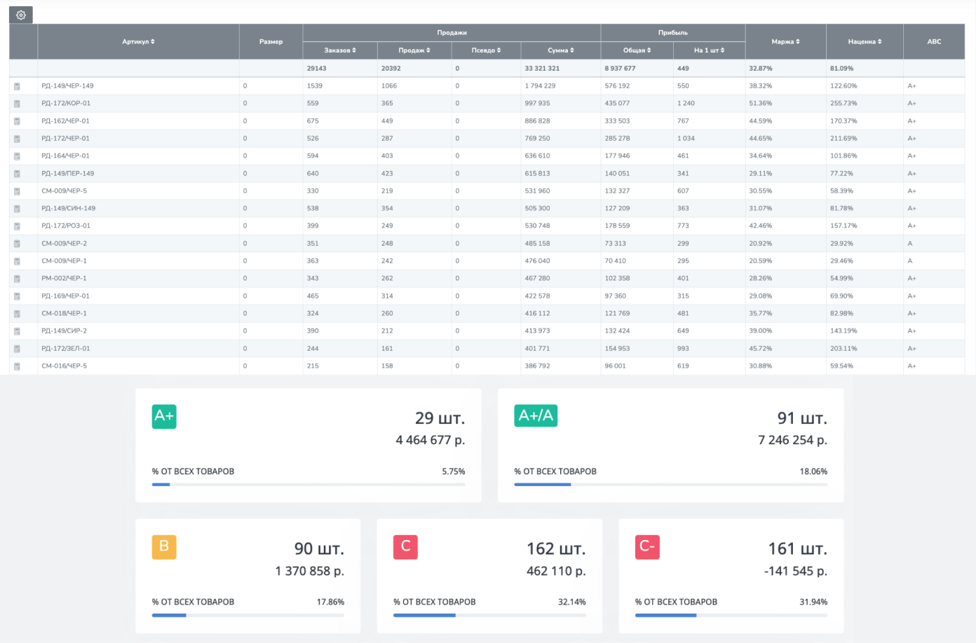 Детализированный расчет чистой прибыли для каждого товара. Вы сможете видеть финансовый результат не только бизнеса в целом, но и по каждому SKU.